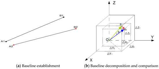By connecting two different points, a baseline is established. In Figure 7a, assuming that and represent the points in epoch I while and are the corresponding points in epoch II, the baselines and are the corresponding baselines within one scan in different epochs. This step is performed in an automated way, which is possible due to the previous sorting of the extracted virtual points.