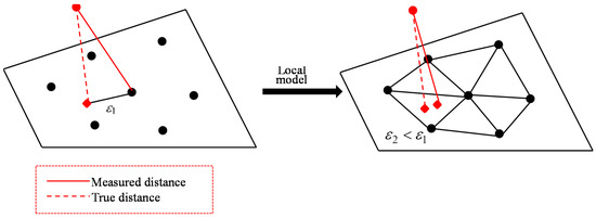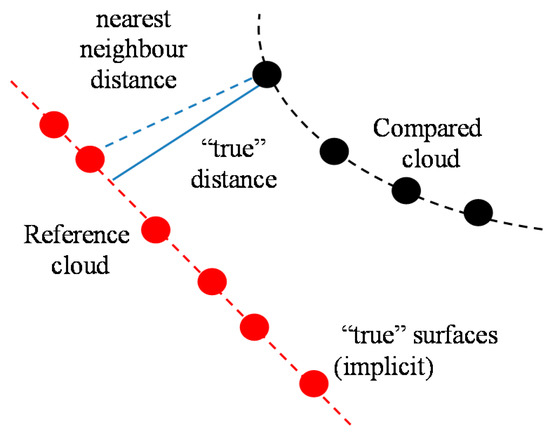 It’s generally not so easy to get a clean and proper global model of a surface. Therefore, the idea of cloud to cloud distance is proposed which is the classical way to detect changes. The principle of nearest neighbour distance is used to compute distances between two points: for each point in the compared cloud, the nearest point in the reference cloud is searched and their Euclidean distance is computed [45], see Figure 8.