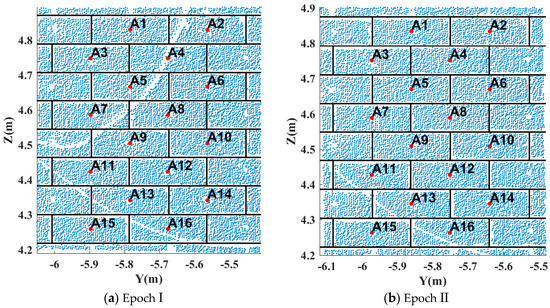 3. Finally, the 3D coordinates of all brick centres are estimated by implementing the method proposed in Section 2.2.2. Patch A contains 16 bricks; Patch B contains three bricks; Patch C contains 15 bricks; Patch D contains six bricks. Figure 12 shows the extraction results of patch A in epochs I and II.