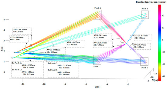 Figure 14 shows the length change for a total of 120 pairs of corresponding baselines between target points and virtual brick centre points, in which “Avg” represents the mean baseline length change and “SD” represents the standard deviation of the baseline length change. Here mean and standard deviation are taken from all pairs of corresponding baselines connecting the same patches and/or targets. The maximum length change, from target “Ta6” to the virtual brick centre point “A16” in patch A, is −67.79 mm in which the minus sign indicates that the length of baseline “Ta6-A16” in epoch II becomes shorter compared to epoch I. All the baselines from “Ta6” and “Ta7” to virtual brick centre points became shorter. This indicates that the moving wall as a whole tilted to the left during the experiment. The baselines from “Ta3” to virtual brick centre points in patch A and patch C become longer, while baselines from “Ta3” to virtual brick centre points in patch B and patch D became shorter. This contrasting pattern could match the previous pattern of the moving building tilting to the left: patch A and patch C move away from “Ta3”, while patches B and D move towards “Ta3”.