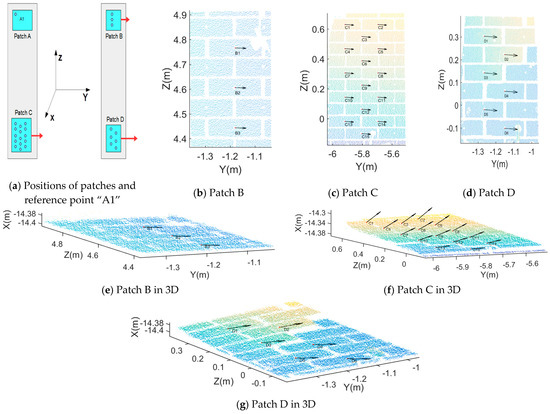 For easier interpretation of the detected changes, difference vectors between corresponding baselines are plotted relative to an arbitrary reference point “A1”. Figure 17a shows the position of point “A1” and the other three patches. The difference vectors from the perspective of X axis between corresponding baselines incident to “A1” are plotted in Figure 17b–d. However, these figures do not illustrate possible displacements in the X direction. Therefore, additional difference vectors in 3D between corresponding baselines incident to “A1” are plotted in Figure 17e–g.
