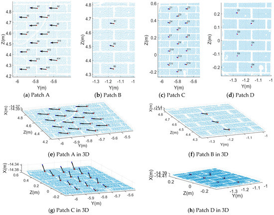 After registration of the two epochs of data, all virtual brick centre points in each patch were extracted. We compared the 3D coordinates of the corresponding virtual points from two epochs and determined the change in X, Y and Z direction. Figure 18a–d show the change arrows for four patches projected on the YOZ plane. In patches C and D, the length of the change arrows is shorter than in patches A and B which indicates that the changes in Y and Z direction are small compared to patch C and patch D. In order to reveal changes in the X direction, change arrows for four patches are plotted in 3D in Figure 18e–h. From the above figures, we draw the conclusion that patch C moved in the X direction. Furthermore, there have a big difference of every virtual points in patch C which prove that damage happened in patch C not just shift movement.