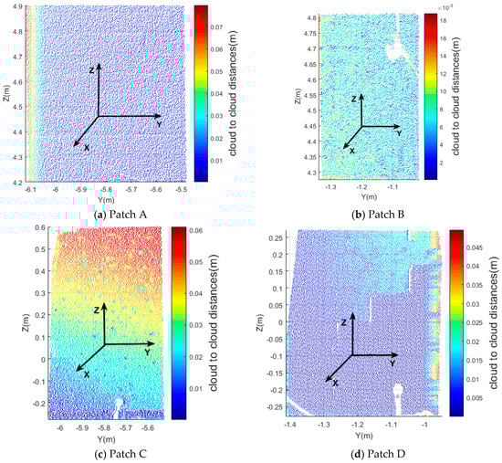 Figure 20 shows the cloud-to-cloud distances for the four patches (A, B, C, D). As shown in Section 2.3.3, cloud-to-cloud distances are nearest neighbor distances not the distances between the corresponding points or features, therefore the change values are different from the baseline method and virtual point comparison. Please note that the cloud-to-cloud distances are absolute values, and therefore have no sign, in contrast to the change vectors obtained by the baseline method. The maximum cloud-to-cloud distances of patch A (top-left), B (top-right), C (bottom-left), and D (bottom-right) are about 0.076, 0.018, 0.061 and 0.050 m, respectively. In patch A, the distances are consistent from left to right. The biggest change is on the left side of the patch which shows the uniform move to the left, namely in the opposite Y direction. In patch B, there is a hole without points which is the results of an occlusion by a piece of wood. The cloud-to-cloud distance of patch B is small compared to the other patches. In patch C, the distances on the top are greater than on the bottom which indicates the damage that happened in this area is significant which corresponds to the results discussed in Section 3.4.2. In the middle of patch D, the distances are not consistent (an obvious fault exists). However, the absolute values of the distances are relatively low which indicates that only small damage happened in this area.