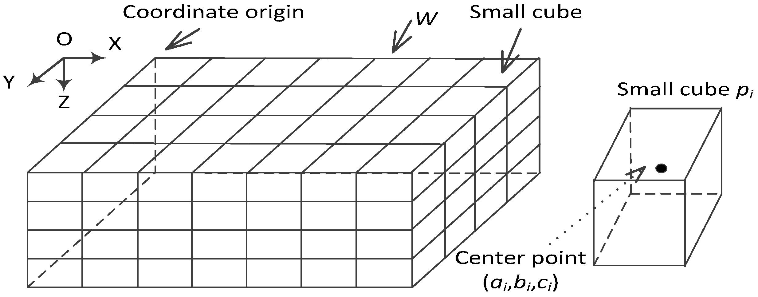 As is shown in Figure 1, the 3D underwater space is a large cube [33] divided into a number of small cubes whose side lengths are w. All the small cubes have selected their center points to represent themselves. The coordinates of cube pi is (ai,bi,ci).
