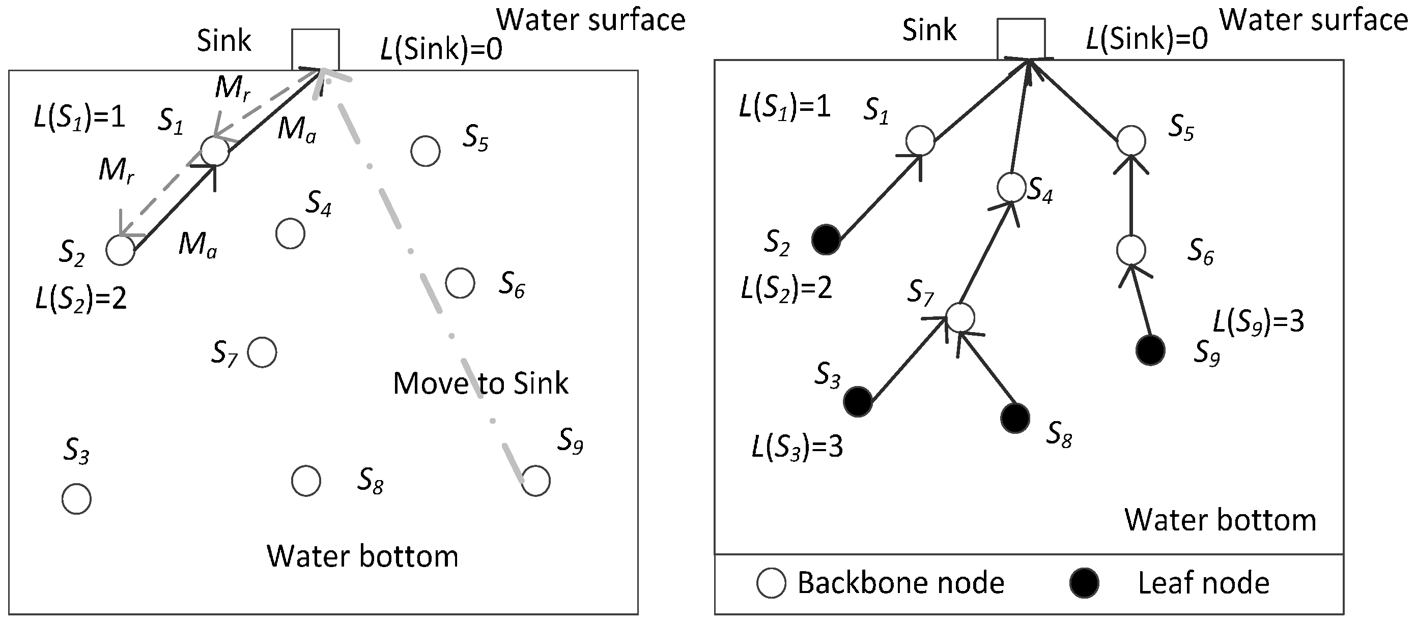 Step 4: The sink node set its state at the ready state and all the other nodes set their states at the non-ready states. If node si has not received any ready information Mr, it moves to the sink node along the straight line. During the movement, it opens its data receiving module to catch the ready information Mr and stops moving upon the reception of Mr. At the same time, the network is stratified level by level from the sink node. The corresponding description is shown in Figure 4. The process and result are shown in Figure 5 (a network comprised of 9 nodes is taken as the example). After finishing the network stratification, the whole network topology is changed into a stratified connected tree that takes the sink node as the root node, which helps to achieve full network connectivity. In the stratified connected tree, if node si has received any acknowledging information Ma, it has one or more child nodes and is considered as a backbone node; otherwise, node si has no child node and is considered as a leaf node.