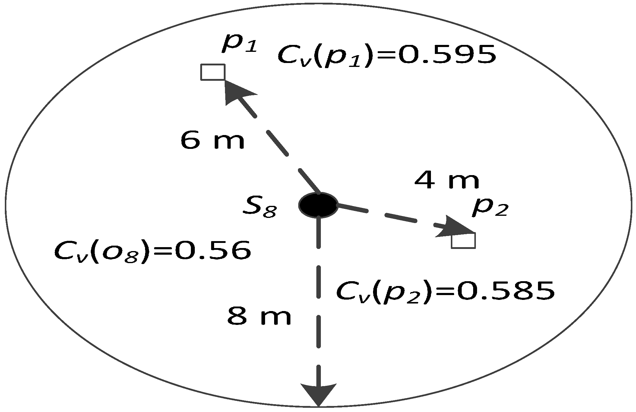 During the calculation of the final destination location for the strong leaf node, it is necessary to consider how to limit the node movement distance, since the movement energy consumption is huge and node energy is limited and difficult-to-supplement in the water environment. Therefore, in Equations (15) and (16), measures are taken to limit the node movement distance. Taking node s8 as the example, in Equation (15), the calculation of d1 (value is 8 m) limits the movement distance by ensuring that node s8 is still strong after the current movement; while the calculation of d2 (value is 10 m) limits the movement distance by ensuring that node s8 will not consume excessive energy during the current movement. By using Equation (16), the node movement distance is also limited when requiring the node to move toward its final destination location to improve the network coverage rate. As is shown in Figure 6, point p1 and p2 belong to the set Cd = C1∩C2. If node s8 chooses p1 as its final destination location, it should move 6 m to gain 0.035 network coverage rate improvement; however, if node s8 chooses p2 as its final destination location, it should move 4 m to gain 0.025 network coverage rate improvement. Since moving toward p2 can gain more network coverage rate improvement per movement distance, node s8 will prefer to choose p2 rather than p1.