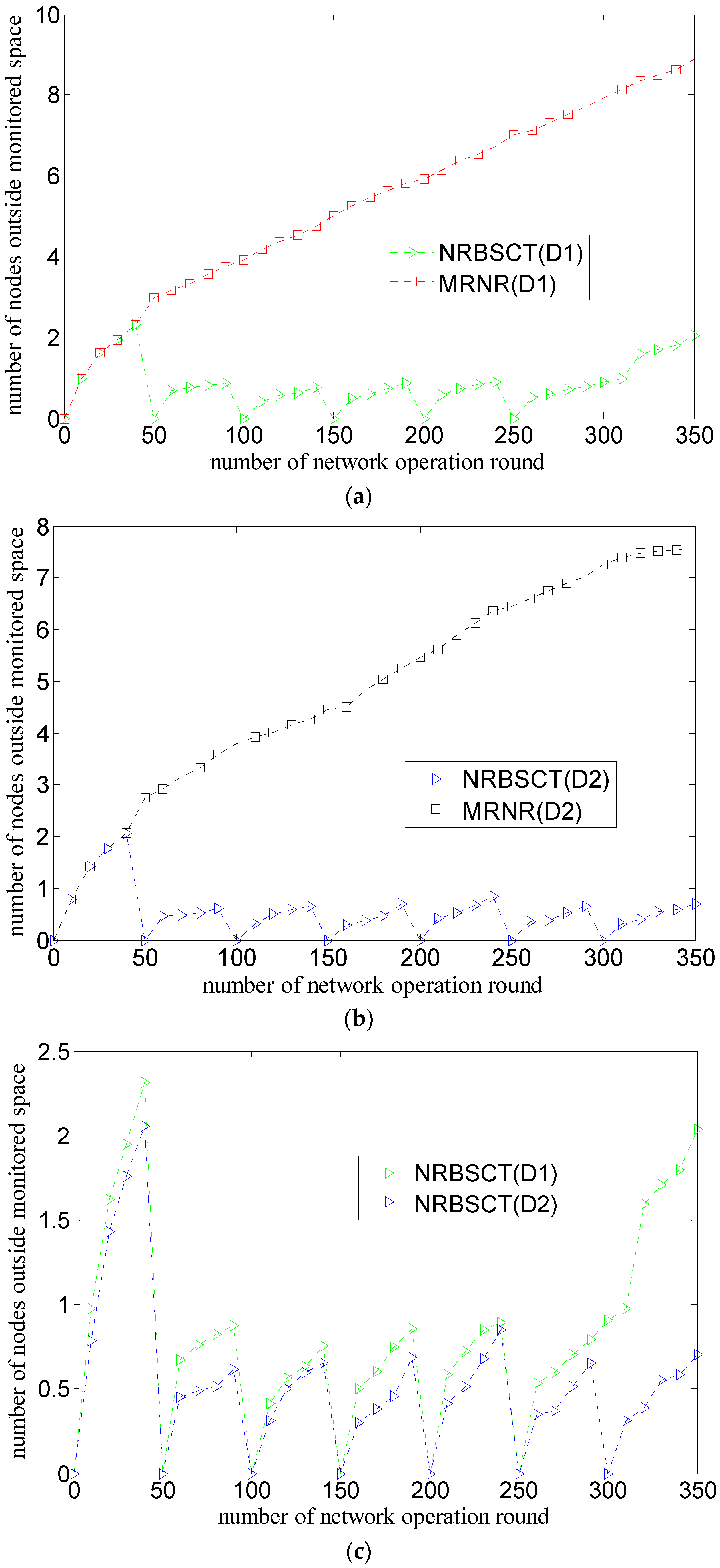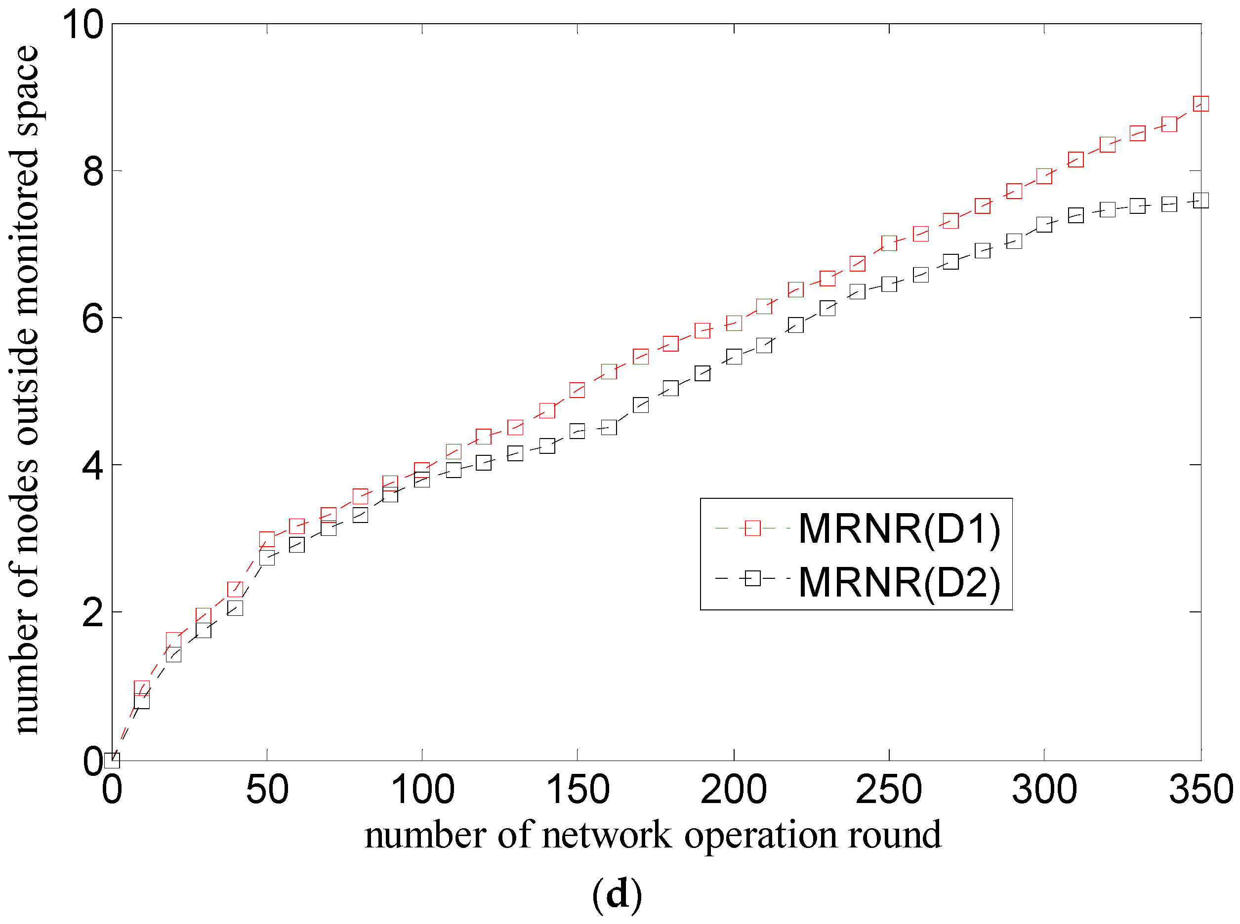 Comparison of number of nodes outside monitored space during network operation: (a) different algorithms and same network distribution (D1); (b) different algorithms and same network distribution (D2); (c) different network distribution and same algorithm (NRBSCT); and (d) different network distribution and same algorithm (MRNR).