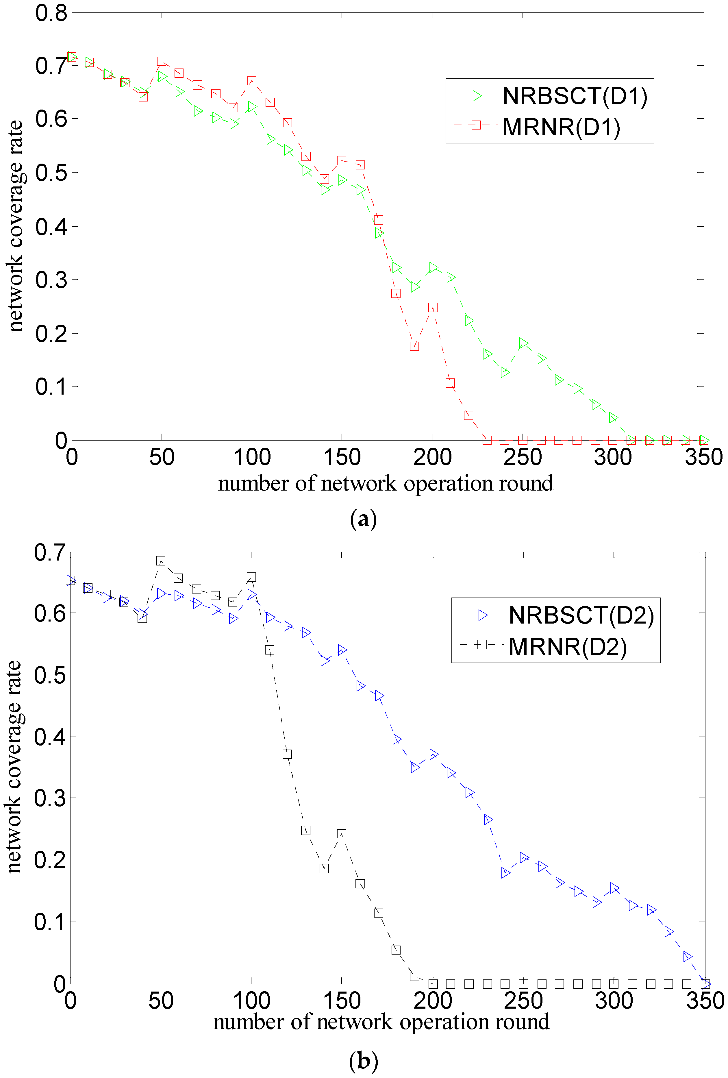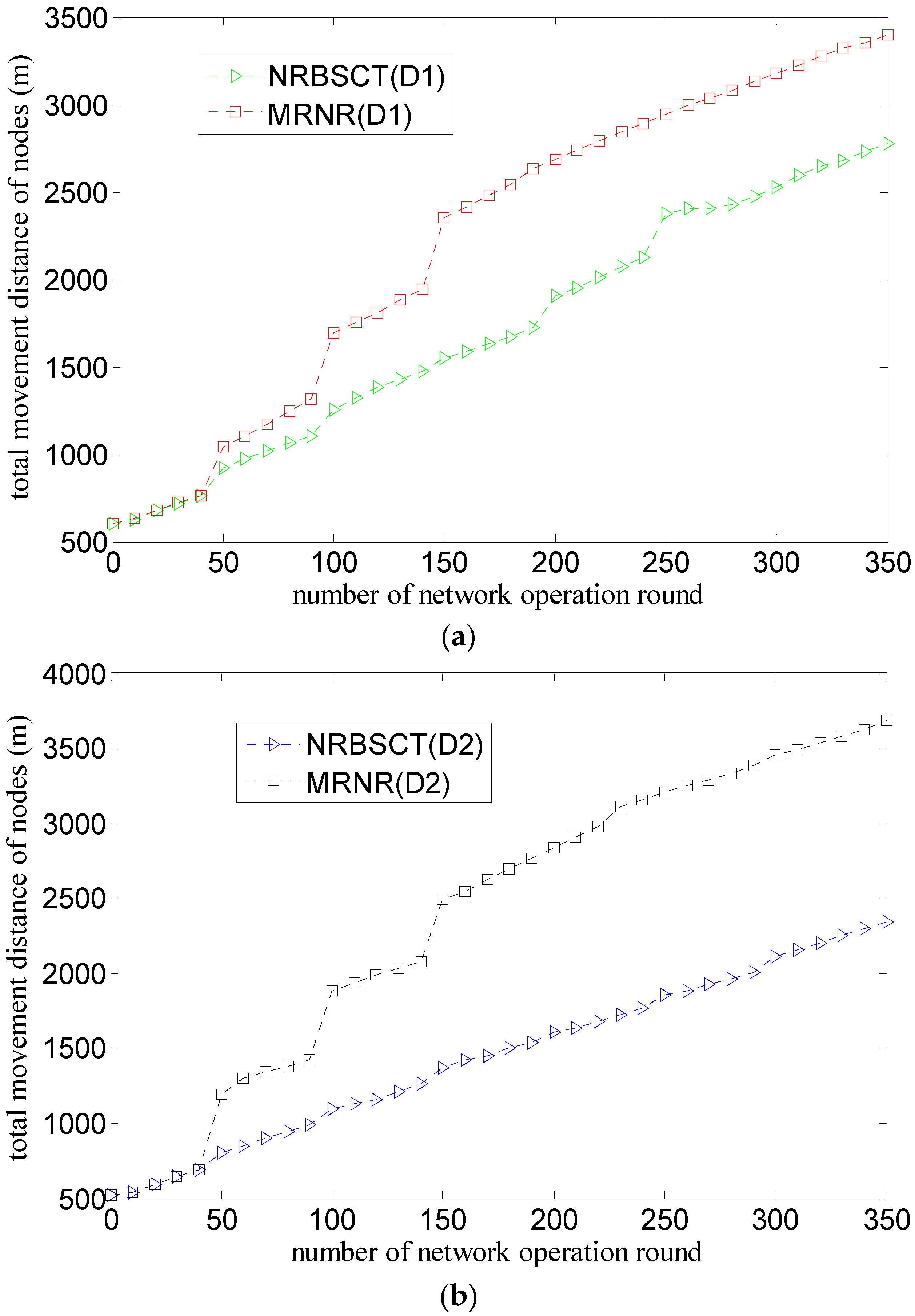 As shown in Figure 8a,b, for both of these algorithms, the network coverage rates will decrease during network operation from the whole. The reason is that some nodes drift out of the monitored space and some nodes die from energy depletion. However, when the network operation time is just the network adjustment moment, both of these two algorithms can contribute to the network coverage rate improvement to some extent since they propose the corresponding methods. Specifically, at the beginning of network operation (i.e., from the start to the 176 rounds for the initial network distribution D1 and to the 103 rounds for the initial network distribution D2), the MRNR algorithm can always achieve a higher network coverage rate than the NRBSCT algorithm; however, at the end of the network operation, the network coverage rate for the MRNR algorithm degrades dramatically with a relatively short network lifetime (i.e., 215 rounds for the initial network distribution D1 and 174 rounds for the initial network distribution D2), and that for the NRBSCT algorithm can remain a certain level for a longer network lifetime (i.e., 275 rounds for the initial network distribution D1 and 326 for the initial network distribution D2). The reason is that the MRNR algorithm only focuses on maximizing the network coverage rate, which results in a higher network coverage rate; however, compared with the MRNR algorithm, the proposed NRBSCT algorithm not only considers how to keep nodes from drifting out of the monitored space, but also tries to shorten node movement distance when the sink node conducts centralized optimization on leaf node locations, which can help to save movement energy consumption and keep the network coverage rate at a certain level for a longer network lifetime.