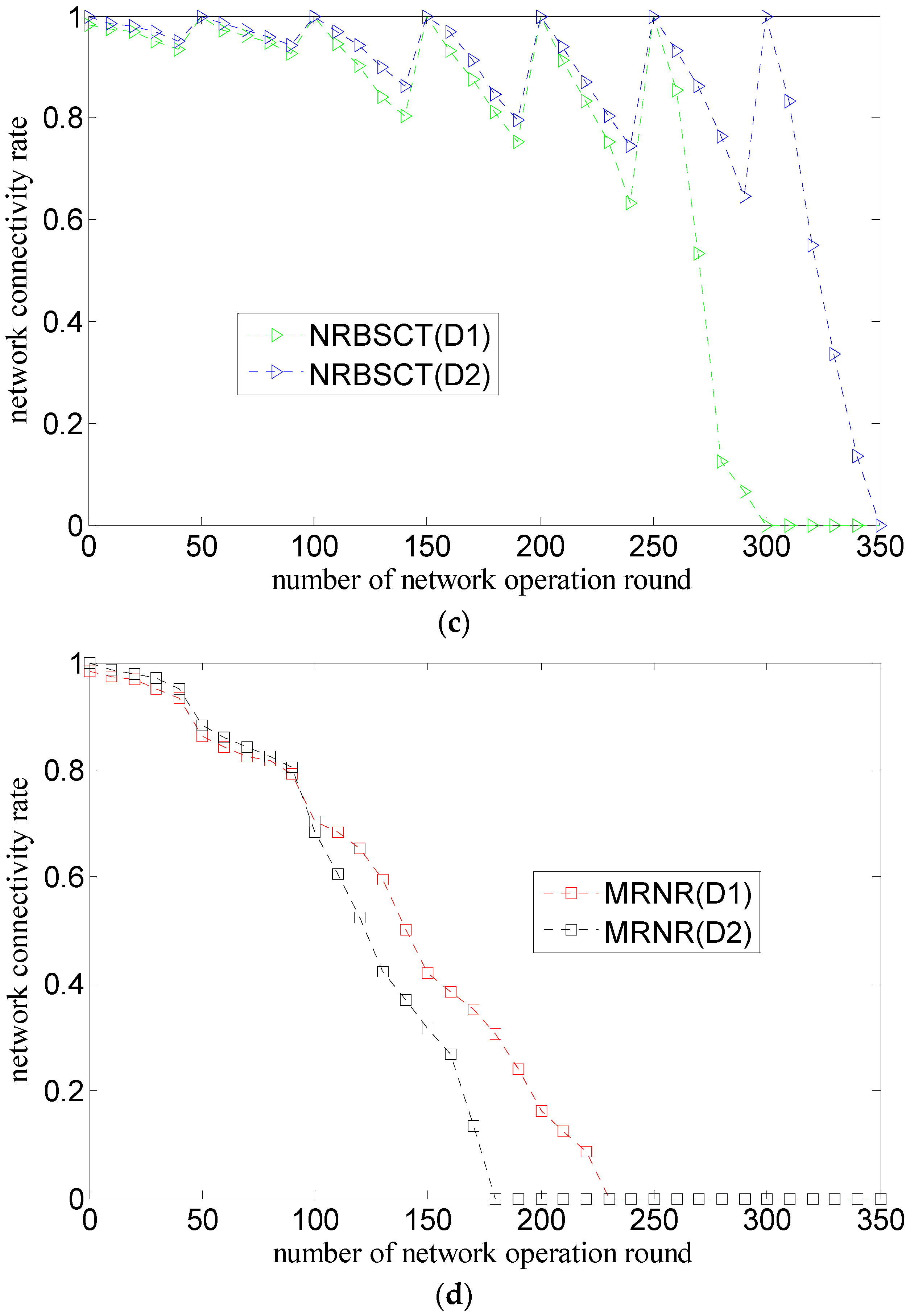 As shown in Figure 9c,d, for the NRBSCT algorithm, compared with the initial network distribution D1, the network connectivity rate in the case of the initial network distribution D2 is relatively higher, which may be the result of the fact that the majority of nodes in the initial network distribution D2 tend to be located in the area near the sink node. However, the same regularity can only hold for a short network operation time for the MRNR algorithm (i.e., 98 rounds), the reason is that at the network adjustment moments, in order to increase the network coverage rate, the MRNR algorithm requires nodes in the dense area near the sink node to move to the sparse area far away from the sink node, which will degrade the network connectivity.