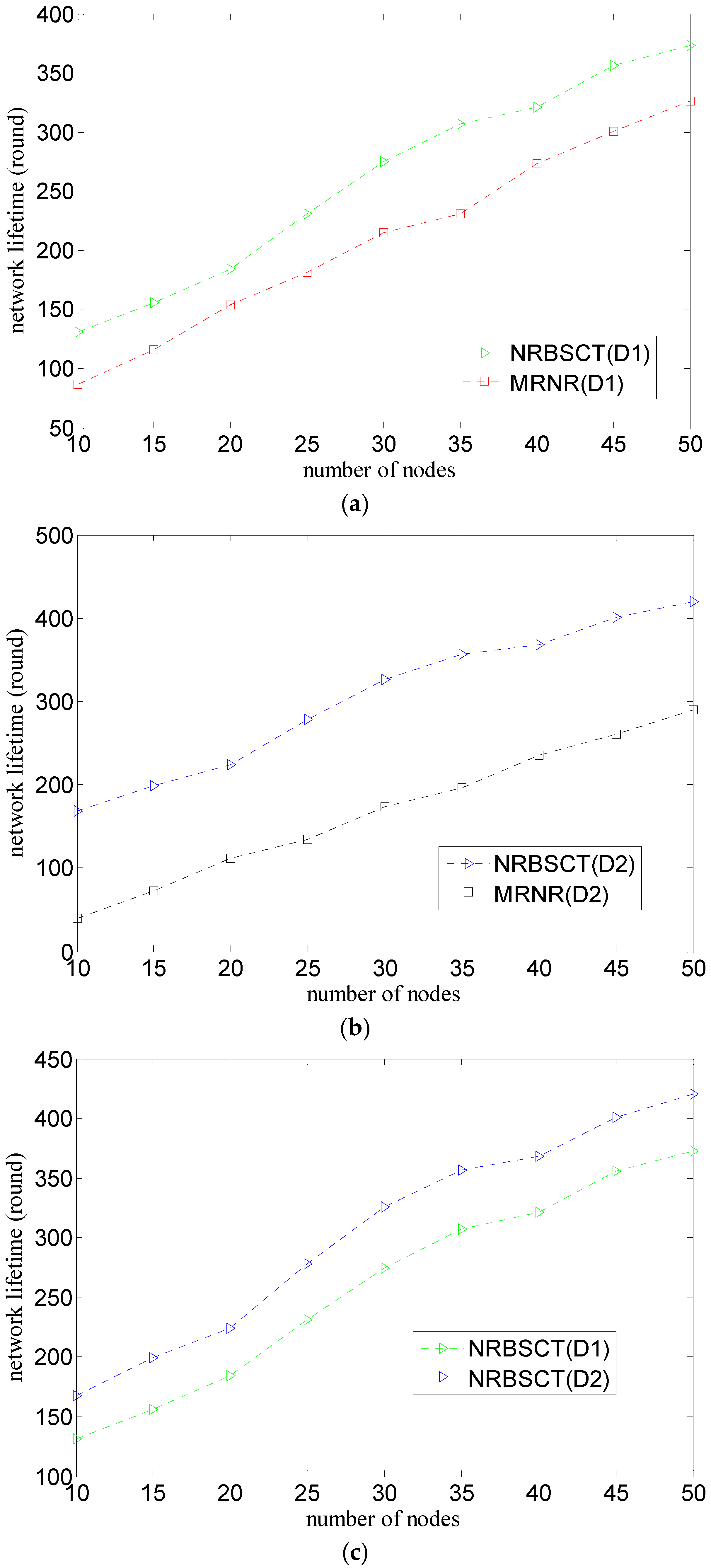 Figure 11 shows the comparison of the relationship between the network lifetime and the number of nodes considering both the initial network distribution (D1 or D2) and the network redeployment algorithm (MRNR or NRBSCT), where the number of nodes varies from 10 to 50.