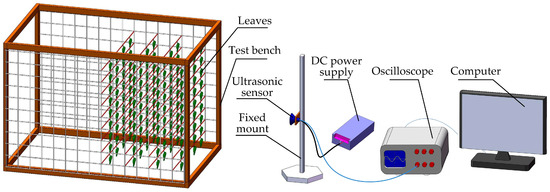 The target density detection system included a test bench, an ultrasonic sensor, a fixed mount, a DC power supply, an oscilloscope and a computer. The detection system was developed as shown in Figure 2. It provided a controllable test environment in which density and detecting distance could be accurately adjusted.