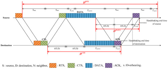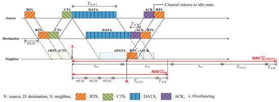 where denotes the NAV calculated by overhearing the packet X of scheme Y, corresponds to the sum of the three-way propagation delays associated with the CTS, data, and ACK, and denotes the transmission time of packet X. is the maximum propagation delay that can exist between two nodes in the network. It is shown that the NAV is unnecessarily long, which tends to degrade the channel utilization and throughput. In an effort to reduce the NAV, DYNAV [24] replaces with the source–destination propagation delay . Thus,