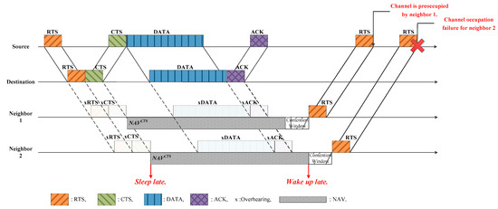 The use of definitely reduces NAV. However, considering the long propagation delay in the acoustic channel, the NAV is still too large compared to the communication time and should be reduced further. Let us consider a time instant, denoted by point B in Figure 1, such that the neighbor may transmit a new RTS even during data overhearing without causing collisions at the source or destination [27,28]. That is, the neighbor can wake up before the NAV expires. In this paper, we utilize this feature to reduce the NAV.