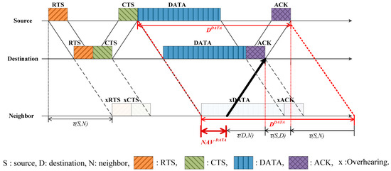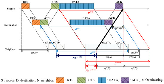 In a similar manner, the extra NAV for the case where a neighbor is located between the source and the destination is also obtained. Regarding the node arrangement, a neighbor is able to calculate the arrangement based on the propagation delays , , which are calculated or obtained by referring to the message fields—TimeStamp and Prop.Delay.