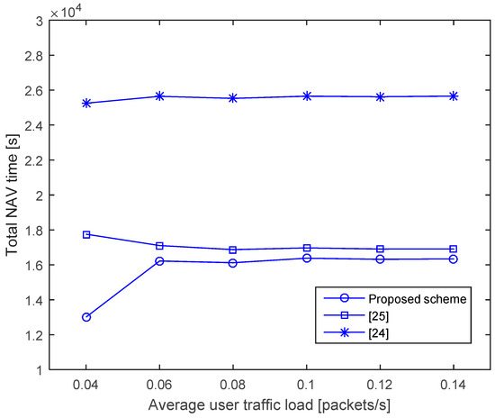 Figure 8 shows the total NAV, which is the sum of the NAVs of individual nodes with varying traffic loads. The user traffic is assumed to be generated by the Poisson arrival process at a rate between 0.04 and 0.14 packets per second. As shown in the figure, the proposed scheme and that of [25] have much smaller NAVs than the scheme in [24], as in [24], the NAV is extended for every packet overheard. In contrast, the proposed scheme and that of [25] selectively extend the NAV under specific conditions. However, the proposed scheme achieves better reduction of the NAV than in [25] by considering the internodal propagation delay. Not only does the proposed scheme achieve the lowest NAV times, it is also highly time efficient because unnecessary wait times are eliminated.