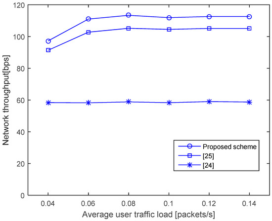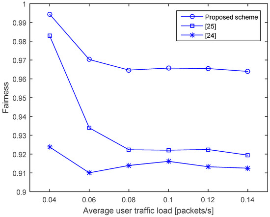where xi is the throughput of node i (i = 1, 2, …, n). The index value ranges from (worst case, which occurs when only one node is able to deliver data while others deliver nothing) to 1 (best case, which occurs when all nodes deliver the same amount of data to the destination node). In Figure 11, it can be observed that the fairness decreases as the traffic increases, owing to the increase in the throughput differences among the nodes. As expected, the proposed scheme shows higher fairness values compared to the schemes in [24,25]. This is largely due to the fact that in the proposed scheme, the neighboring nodes have almost equal probability of channel occupation regardless of the node position—a consequence of considering the propagation delays of the nodes. Meanwhile, the fairness performance of [24] is the worst when compared to others, as [24] sets the NAV whenever it overhears a packet and a node that has many neighbors will have a relatively longer silent period, reducing its channel-occupation probability.