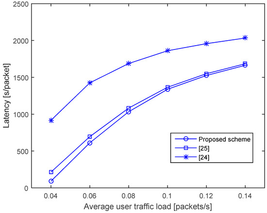 Figure 10 shows the latency, which is defined as the average duration from the moment a packet is generated to the moment the packet is successfully delivered. For higher traffic loads, in general, the latency increases as collisions become more frequent, and the queueing delay until the channel is free also increases. Moreover, the latencies of the schemes with higher network throughputs (proposed scheme and [25]) are obviously lower because a higher network throughput also implies shorter queueing delays and fewer collisions. As expected, the proposed scheme achieves better latency as a consequence of optimizing the NAV.