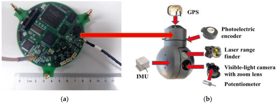 (a) Multi-target geo-location and tracking circuit board; (b) Electro-optical stabilized imaging system. The arrows in the Figure 1b represent the installation locations of main sensors in an electro-optical stabilized imaging system.