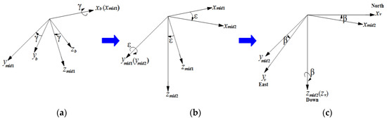 The coordinate frames relation: roll-pitch-yaw rotation sequence between body and vehicle frames. (a) body frame; (b) intermediate frame; (c) vehicle frame.