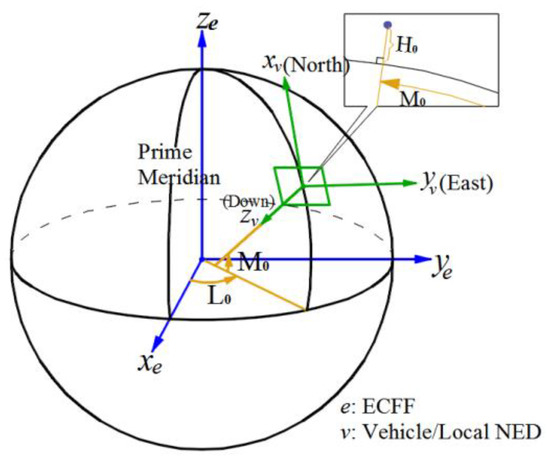 The relation between vehicle frame and earth centered earth fixed (ECEF) is shown in Figure 6.