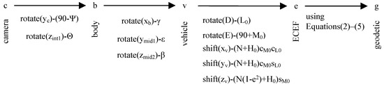 Five coordinate frames (camera frame, body frame, vehicle frame, ECEF frame and geodetic frame) are used in this study. The relative relationships between the frames are shown in Figure 4. All coordinate frames follow a right-hand rule.