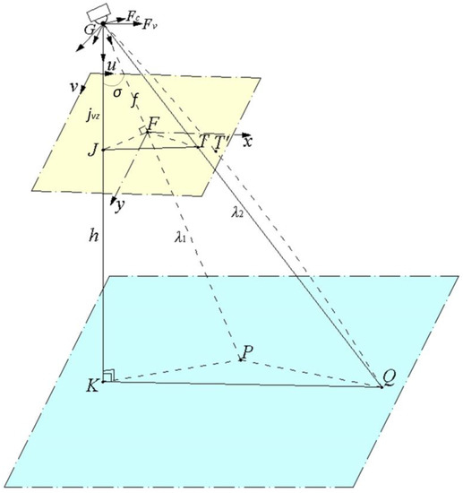 The key of sub-target geo-location is to build a geometrical geo-location model. The coordinates of sub-targets in the camera frame are solved on the basis of their pixel coordinates, and then their geodesic coordinates are calculated in accordance with the coordinate transformation Equations (1)–(5), Suppose the ground area corresponding to a single image is flat and the relative altitudes between targets and electro-optical stabilized imaging system are the same. Based on the image forming principles for single-plane array charge coupled device (CCD) sensors, a multi-target geo-location model can be established, as shown in Figure 8.