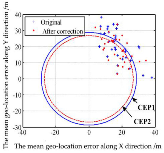 The multi-target geo-location errors before the distortion correction are processed through the Equations (43)–(50) to calculate the CEP, whereas the mean geo-location errors along the and directions are 17.41 m and 20.34 m, respectively, the standard deviations of the geo-location errors along the and directions are 7.77 m and 10.05 m, respectively, and the total mean geo-location error and total standard deviation are 28.98 m and 6.08 m, respectively. The calculation of Equation (46) through numerical integration finds that, among the 32 samples, 16 are in a circle with a radius of 28.74 m, which means the probability is 50%. The sizes of data samples inside and outside the solid circle in Figure 10 also show that, the CEP1 of multi-target geo-location before the distortion correction is 28.74 m. Then the multi-target geo-location errors after the distortion correction are processed through Equations (43)–(50) to calculate the CEP, where the mean geo-location errors along and directions are 17.04 m and 18.63 m, respectively, the standard deviations of the geo-location errors along and directions are 6.86 m and 8.25 m, respectively, and the total mean geo-location error and total standard deviation are 26.91 m and 5.31 m, respectively. The calculation of Equation (43) through numerical integration finds that, among the 32 samples, 16 are in a circle with a radius of 26.80 m, which means the probability is 50%. The sizes of samples inside and outside the dotted circle in Figure 10 also show that, the CEP2 of multi-target geo-location after the distortion correction is 26.80 m, 7% smaller than that before the distortion correction. Note: We use original geo-location error (32 samples scattered in the four quadrants) to calculate the CEP circle. Because there are 32 samples scattered in the four quadrants. It’s too scattered and not conducive to the analysis of the error. Therefore, we take the absolute value of each geo-location error, so all points are in the first quadrant in Figure 12.