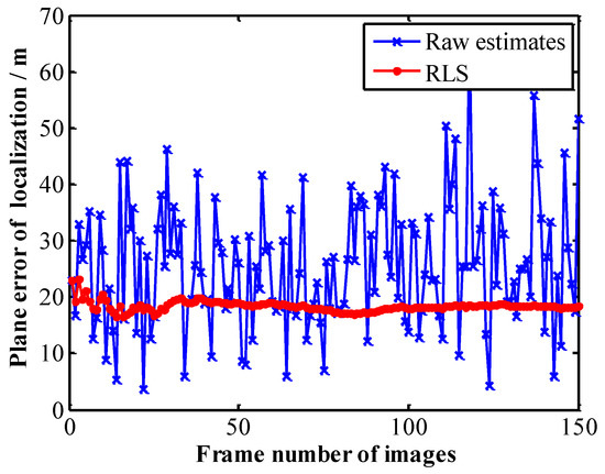 - When it is necessary to locate a new stationary target, the RLS algorithm needs 3–5 s to converge to a stable value (within 5 s, lens distortion correction is implemented in real-time, the output rate is 25 Hz). After 5 s, the geo-location errors of the target have converged to a stable value. We can obtain a more accurate location of this stationary target immediately (it is no longer necessary to run RLS). That output rate is 25 Hz, too.