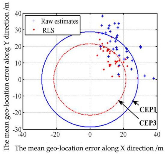 5.5. Test 3: RLS Filter for Geo-Location Data of Multiple Stationary Ground Targets