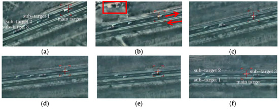 Multiple moving targets in aerial video. (a–f): frame1, frame 3, frame 4, frame 6, frame 7, frame 9.