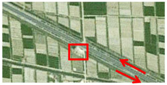 Since both the UAV yaw and the electro-optical stabilized imaging system azimuth are not 0 in general, aerial images have been rotated and distorted somewhat. The aerial orthographic projection of the abovementioned highway, as shown in Figure 18, is acquired from Google Maps. It can be known from Figure 18 that, the actual direction of that highway is northwest–southeast. In China, cars drive on the right side of the road, so the house in Figure 18 is near the highway which is from northwest to southeast direction. In Figure 16b, we can see this house, so all the cars are on the road travelling in a northwest to southeast direction. This coincides with the localization results of Figure 17.