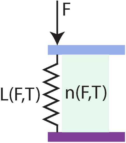 The change in length of the FPI cavity upon exertion of force is assumed to be equal to the change in length of the spring plus the change in geometrical length of the cavity due to expansion of the material connecting both mirrors. This geometrical change of cavity length is assumed to depend linearly on the temperature of the sensor and to be proportional to the coefficient of thermal expansion (CTE) of the spring’s material and the length of the FPI cavity (this definition implies that the length of the spring does not have to match the length of the FPI cavity). The length of the cavity is when no force is exerted on the sensor for a given temperature. The cavity length is thus: