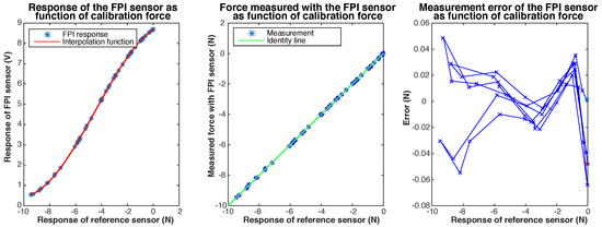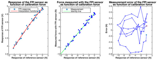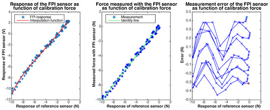 Results of static calibration of a prototype of the Invar capillary concept, not accounting for transverse force on the needle tip. The response of the FPI as function of the calibration force, together with a ploynomal fit, is shown on the left. The graph in the center shows the force measured with the FPI, calculated using the interpolation function, as function of the calibration force and the indentity line () as a reference. The measurement error of the FPI-based sensor as function of the calibration force is shown on the right.
