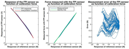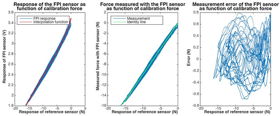 Results of static calibration of a prototype of the quartz capillary concept. The response of the FPI as function of the calibration force, together with a fitted sinusoidal interpolation function, is shown on the left. The center figure shows the force measured with the FPI, calculated using the interpolation function, as function of the calibration force and the indentity line () as a reference. The measurement error of the FPI sensor as function of the calibration force is shown on the right.