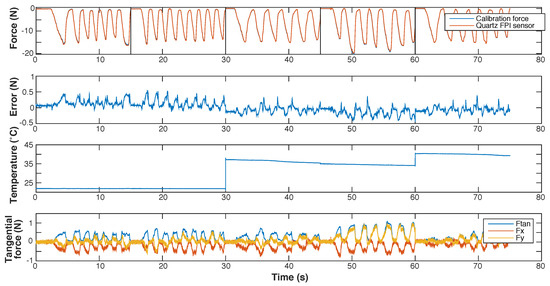 Results of dynamic calibration with temperatures varying between 22 °C and 40° of the prototype of the quartz capillary concept, shown as function of time. The graphs show, from top to bottom: (1) the calibration force and the force measured with the prototype, calculated using the interpolation function shown in Figure 9; (2) the measurement error of the prototype; (3) the temperature of the water bath in which the needle tip is submerged; (4) the transverse force on the needle tip, shown as the resultant transverse force (Ftan) and its two orthogonal components (Fx and Fy). The dotted lines in the top graph (1) indicate the 15 s long fragments of which the dynamic calibration dataset is composed.