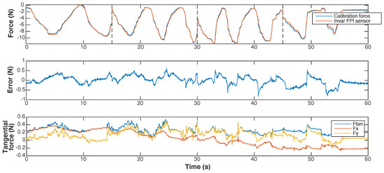 Results of dynamic calibration of a prototype of the Invar capillary concept at room temperature shown as function of time. The graphs present, from top to bottom: (1) the calibration force and the force measured with the prototype, calculated using the interpolation function shown in Figure 12; (2) the measurement error of the prototype; (3) the transverse force on the needle tip, shown as the resultant transverse force (Ftan) and its two orthogonal components (Fx and Fy). The dotted lines in the top graph (1) indicate the 15 s long fragments of which the dataset obtained during dynamic calibration is composed.