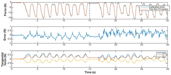 Calibration results of dynamic calibration of a proof-of-concept of the thin-film concept at room temperature, shown as function of time. The graphs show, from top to bottom: (1) the calibration force and the force measured with the proof-of-concept, calculated using the interpolation function shown in Figure 15; (2) the measurement error of the proof-of-concept; (3) the transverse force on the needle tip, shown as the resultant transverse force (Ftan) and its two orthogonal components (Fx and Fy). The dotted lines in the top graph (1) indicate the 15 s long fragments of which the dataset obtained during dynamic calibration is composed.