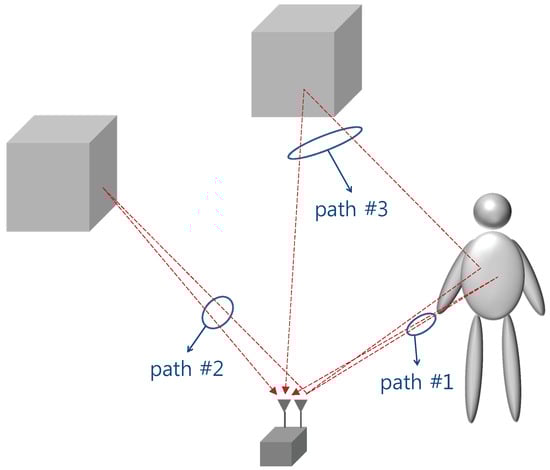 An indirect reflection that includes the target and other objects in the reflection path can cause a ghost problem [,,]. Figure 1 illustrates this phenomenon. In this figure, path number 1 (direct path) contains the range information of the target. Path number 2 receives static background signals that can be removed via the moving target indication (MTI). Path number 3, namely the indirect path, contains multiple reflections from a human body and the background objects. The indirect path signals survive the MTI process and thus generate ghost targets. The deterministic method has been suggested for detecting an indirect path. For example, Shen and Molisch [] adopted a deterministic approach, using measurement parameters such as the time of arrival (ToA), direction of departure, and direction of arrival. If a statistical model of the indirect path is available, it will be possible to employ a stochastic approach based on the model. However, no statistical model of the indirect path has yet been proposed, although a study on propagation characterization for UWB sensors exists. In this study, we performed statistical modeling of the indirect path that occurs under an indoor human tracking condition. To achieve this, a comprehensive measurement campaign was performed in an indoor environment, and a cluster model was established based on the measured data. This model can be applied to reject ghost targets that are generated by an indirect path.