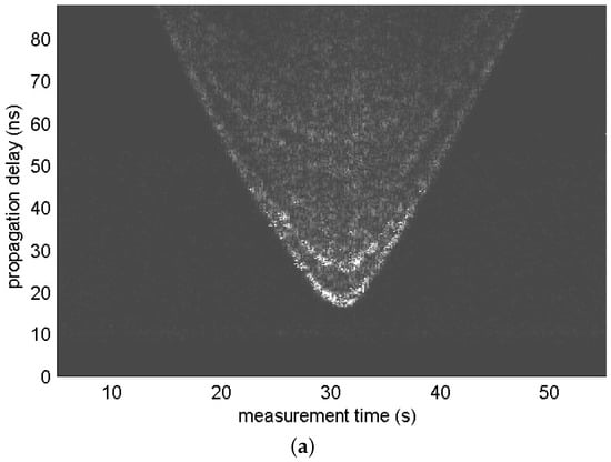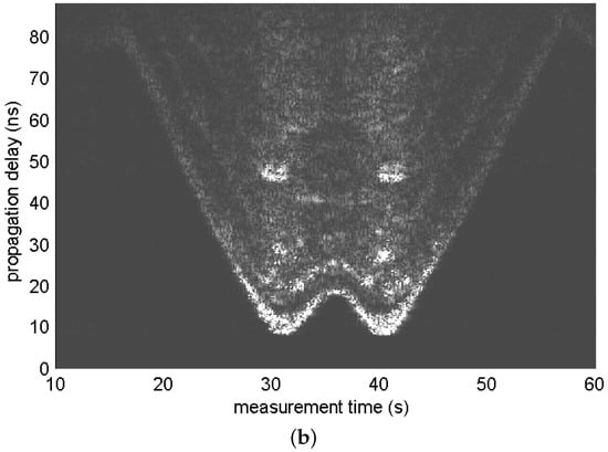 where denotes the impulse response of the high-pass filter. Signal includes the indirect path signal components as well as a direct path signal. Figure 2 shows the radargrams of measurement sets 6 and 7. Signal components that arrived the earliest in each scan observed in the figure represent the trajectory of the distance between the radar and the moving human. We can observe other signal components that arrived later than the abovementioned signal components; these are the indirect path signal components.