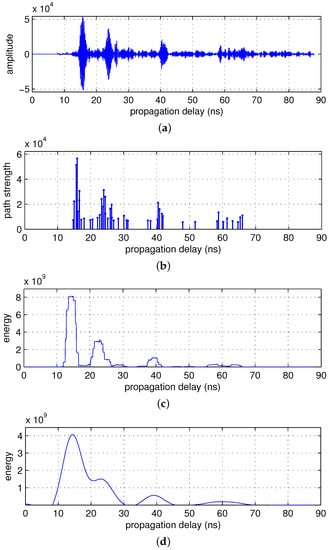 Figure 3a,b shows signal obtained from the 170th scan of measurement set 7 and the magnitude of its impulse response, respectively. Interestingly, we can observe that the signal components are clustered as in the UWB channel model. More than two clusters are observed, which indicates that there are clusters generated by indirect reflections, assuming that only one cluster is generated by a direct reflection. In this study, we use a cluster model with the following impulse response: