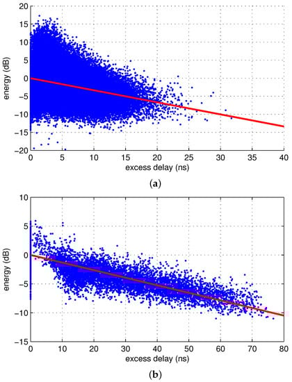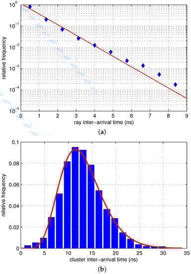 Ray and cluster arrivals are modeled as Poisson processes in the modified Saleh–Valenzuela (S–V) model widely used as the UWB channel model. In this study, exponential fit was applied to the inter-arrival time of rays as in the modified S–V model. Figure 4a shows the distribution of the inter-arrival time of the rays and its exponential fit. The ray arrival rate, namely λ, was obtained to be 1.1521 by measuring the mean inter-ray arrival time.