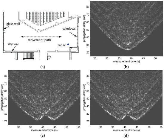(a) Floor plan of the building where the experiments were conducted; (b) radargrams of Scenario 1. One target approached the radar and then moved away while the other repeated motions approaching the radar from a distance and returned back; (c) radargrams of Scenario 2. One target approached the radar and returned, and the other moved along the same path with a certain constant delay; and (d) radargrams of Scenario 3. Both targets approached the radar with some gap between them and moved away from the radar simultaneously.