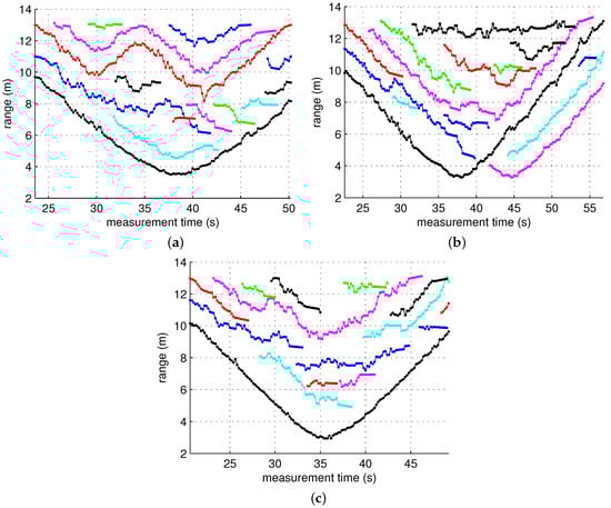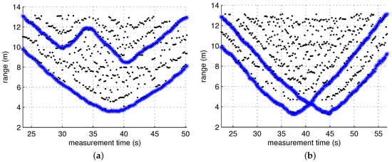 where the measurement noise is also Gaussian with a zero mean and a variance of 0.65. The widely used nearest neighbor method was employed for gating, and the gating threshold was chosen to be 0.87. The initial state is . Figure 10 and Figure 11 show the result of the tracking algorithm applied to three scenarios. In these figures, it is not easy to perfectly distinguish between true tracks and ghost tracks. However, the ghost tracks can be roughly identified by comparing them with the trajectory of the actual distance of the target shown in Figure 7, and it can be seen that the number of ghost tracks noticeably decreased when the ghost rejection algorithm was applied. For example, in Scenario 3, the number of ghost tracks decreased from eleven to two.