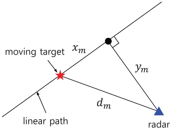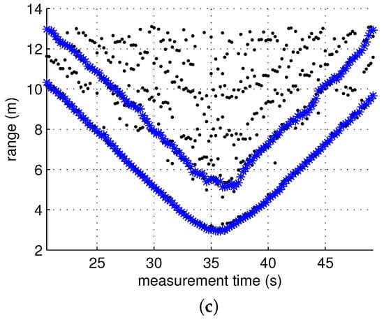 We conducted 1D tracking in the three aforementioned scenarios by applying the ghost rejection algorithm proposed in the previous section. Figure 9 illustrates the measurement scenario introduced in Section 4.1. Parameter refers to the distance from the radar to the target in the scan, indicates the range of the target, and denotes the distance to the straight line path along which the target moved. The multi-target tracking algorithm followed the conventional approach described in []. An extended Kalman filter with the following state model was used for the filtering and prediction process: