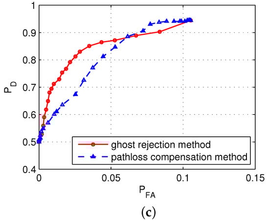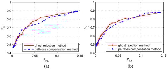 Figure 8 shows a comparison of the receiver operating characteristic (RoC) curves obtained by applying the algorithm proposed in this paper and the path loss compensation method proposed in [,] in the three considered scenarios. In the figures, the results obtained via the former method shows a smaller for the given value than those obtained via the latter method. For example, in Scenario 3, when , the value of is if the former method is used, and if the latter method is used, which are noticeably different values.