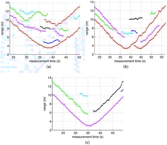 Tracking results for each scenario without ghost rejection. Separate tracks are indicated by different colors. (a) Scenario 1; (b) Scenario 2; and (c) Scenario 3.