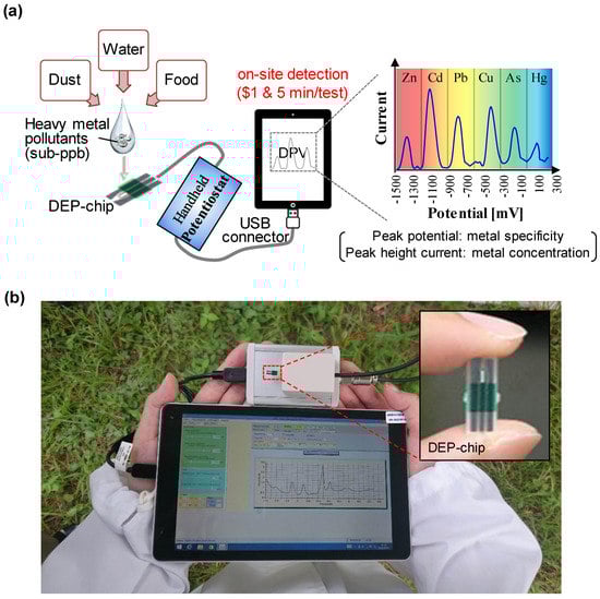 Heavy metal-induced toxicity is an uncommon issue in medical diagnostics and can result in significant morbidity and mortality. There are more than 20 heavy metals [], some of which, such as zinc (Zn) and copper (Cu), are essential for good health in trace amounts. However, excessive exposure to these heavy metals can cause serious health hazards in living organisms because they are not metabolized by the body and, thus, they accumulate in the soft tissues and are associated with negative effects on a series of metabolic pathways [,]. Some typical heavy metals, such as lead (Pb), cadmium (Cd), arsenic (As), and mercury (Hg), are prime examples that are considered systemic toxicants to the human body, even at low levels of exposure. These metals can induce multiple organ damage, including neurological impairment, autoimmune diseases, joint disease, kidney and nervous system damage [,,,]. In addition, several reports based on epidemiological and experimental studies have shown that long-term sub-threshold exposure to these metals results in the promotion of carcinogenesis [,,]. These heavy metals generally enter our environment by natural means, such as soil erosion, geological weathering, and anthropogenic activities, such as industrial effluents, urban runoff, and sewage discharge. Since the contribution of these sources can vary both spatially and seasonally, information on these variations is crucial. The regular monitoring and detection of heavy metal pollutants is a serious and urgent concern for global public health. Furthermore, the synergistic toxicity of multiple heavy metals on human liver cells has recently been reported, and the results suggested that combined effects should be considered in risk assessments of heavy metal-induced toxicity []. Therefore, the simultaneous detection of multiple heavy metals is also of paramount importance to human health. The next challenge is to enable heavy metal testing to be performed in the resource-limited settings that accounts for more than 80% of the world’s population.
