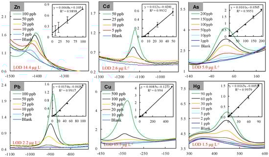 Individual electrochemical measurement of heavy metals in a standard solution using the “DEP-On-Go” system. DP voltammograms and corresponding calibration curves (inset) are shown for the detection of zinc, cadmium, lead and copper using a carbon DEP chip, and arsenic, and mercury using a gold DEP chip. The X-axis and Y-axis represent the potential (mV) and the current (μA), respectively. The X-axis and Y-axis in the insets represent the concentrations of metals (μg·L−1) and calculated peak current heights (μA), respectively. The data are the averages of four to six independent experiments. LOD: limit of detection.