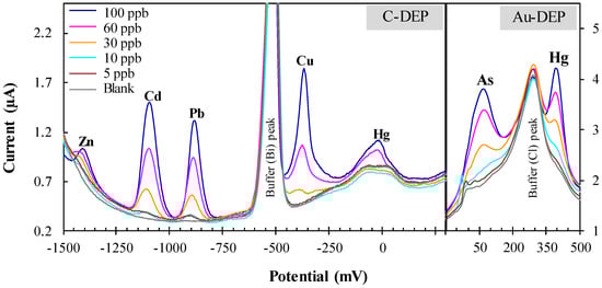 Next, we evaluated the performance of our system for the simultaneous electroanalytical determination of multiple heavy metal standards. The simultaneous detection of several heavy metals is advantageous over time/cost-consuming manual operations, particularly when real samples, such as drinking groundwater are polluted with a mixture of several heavy metals. Nevertheless, the signal of the target metal often experiences interference because of the presence and co-deposition of other heavy metals onto the active site of the electrode surface. Therefore, we also evaluated the performance of our system for the simultaneous electroanalytical determination of lead, cadmium, zinc, and copper using carbon DEP chips and arsenic and mercury using gold DEP chips. The application of chemically-modified carbon working electrodes has provided the simultaneous detection of heavy metals in water samples with enhanced specificity [,]. Bismuth is an environmentally-friendly element with a property to form “fused alloys” with heavy metals which facilitates the nucleation process during accumulation of heavy metals. In addition, bismuth has been widely used for anodic stripping voltammetry to improve stripping characteristics including well-defined and undistorted stripping signal and excellent resolution of neighboring peaks together with high sensitivity [,]. Therefore, to enhance the electroanalytical performance of carbon DEP chips for simultaneous detection, we optimized the operational parameters, including the addition of the bismuth directly to the sample solution and the simultaneous deposit of target metals on the carbon electrode. We simultaneously measured a standard mixture of zinc, cadmium, lead, copper, and mercury for a concentration range between 5 and 100 μg·L−1 with all well-defined and separated peaks (Figure 3). The obtained calibrated result displayed the addition effect on all tested metals for their peak current heights with a liner coefficient value (with correlation coefficients ranging from 0.9968 to 0.9672) and without any interference (Figure S2). This result confirms that the bismuth treatment eliminates cross-interferences, and, thus, the simultaneous determination of zinc, cadmium, lead, and copper was successfully achieved and was as sensitive as of individual determination, the exception being mercury as the limit of the detection sensitivity for mercury on the carbon DEP chip was decreased to 93.3 μg·L−1 (nearly 100-fold less than the sensitivity of the gold DEP chip). We then analyzed and confirmed that arsenic and mercury can be detected sensitively and simultaneously with well-defined and separated peaks using a gold DEP chip (Figure 3). One additional background peak due to supporting electrolytes solution was also observed between arsenic and mercury. These findings confirm that all studied six heavy metals can be detected simultaneously using a simple and unmodified DEP-On-Go system.