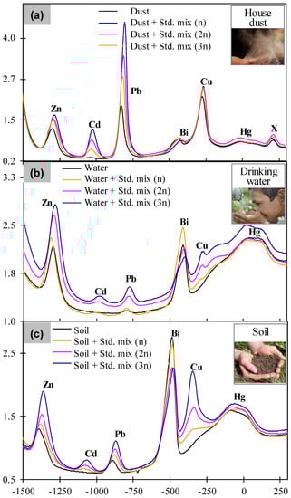 The dust samples were prepared by collecting fresh indoor dust from several rooms in two buildings (Jaipur city in India and Nomi City in Japan) with the aid of a vacuum cleaner. The dust samples were filtered to remove any visible impurities, e.g., hair, paper and other garbage, and then 1 g was added to 10 mL of 0.2 M acetic acid solution and allowing it to stand 1 h while stirring with magnetic stirrer. The mixture was then centrifuged to collect the aqueous phase. The pH of aqueous phase was adjusted to 4.6 with 4 M NaOH solution. The collected aqueous phase was mixed with 0.2 M acetate buffer (pH 4.6) in the ratio of 1:4. For simultaneous determination of Zn, Cd, Pb, Cu, As, and Hg in dust samples, the standard addition method was applied. The samples were prepared by mixing 200 μL of dust sample with 200 μL of standard mixture as indicated earlier (mixture-I is Zn:Cd:Pb:Cu:Hg 100:50:100:20:50 μg·L−1; mixture-II is Zn:Cd:Pb:Cu:Hg 300:150:300:60:150 μg·L−1; mixture-III Zn:Cd:Pb:Cu:Hg 400:200:400:80:200 μg·L−1) prepared in a reagent solution containing 2 mg·L−1 of bismuth nitrate pentahydrate in 0.2 M acetate buffer (pH 4.6). As and Hg in dust samples were also determined by standard addition method (mixture-I As:Hg 50:25 μg·L−1; mixture-II As:Hg 100:50 μg·L−1; mixture-III As:Hg 200:100 μg·L−1; mixture-IV As:Hg 300:200 μg·L−1) in a supportive solution (0.1 M HCl, 0.5 M NaCl).